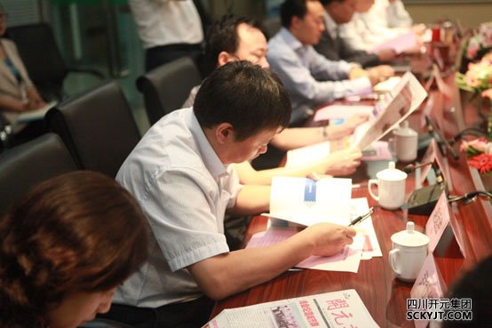 會(huì)領(lǐng)導(dǎo)認(rèn)真閱讀著集團(tuán)文化宣傳手冊(cè)與開元報(bào)